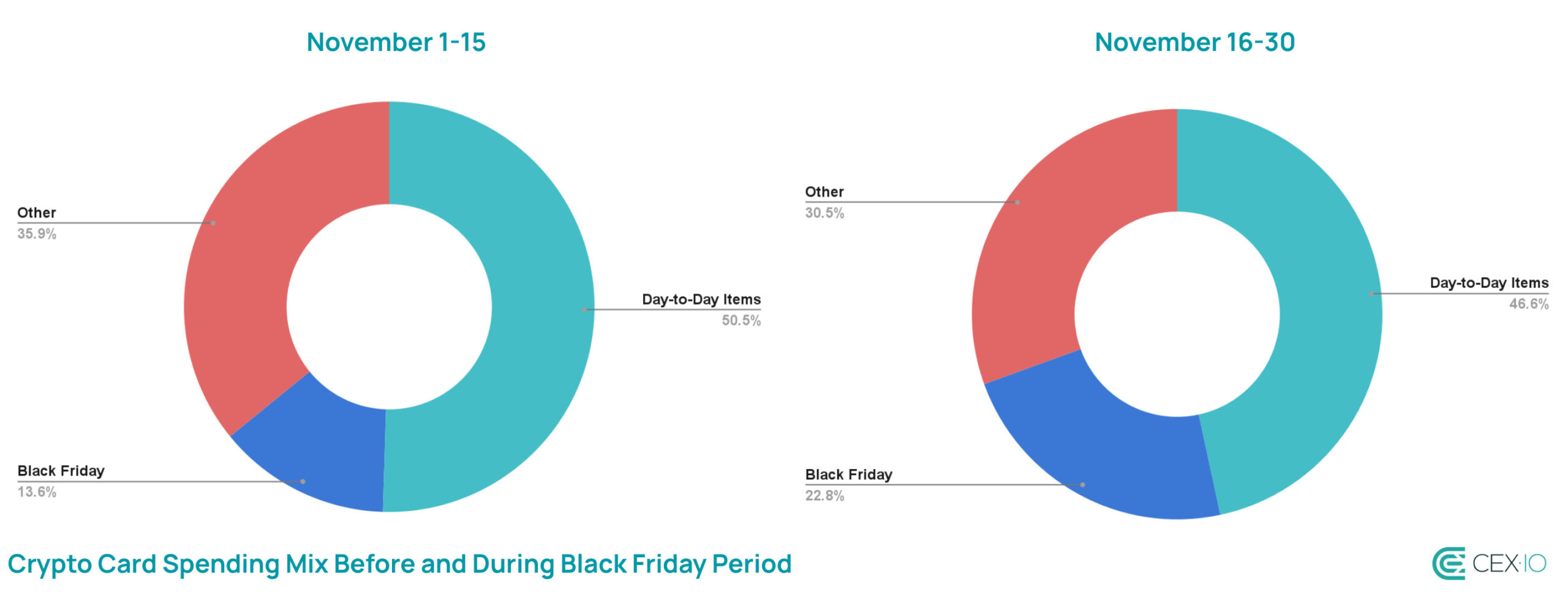 - Crypto card users increased their spending by 33% during Black Friday, with average transactions increasing by 11% — from €48 to €53.