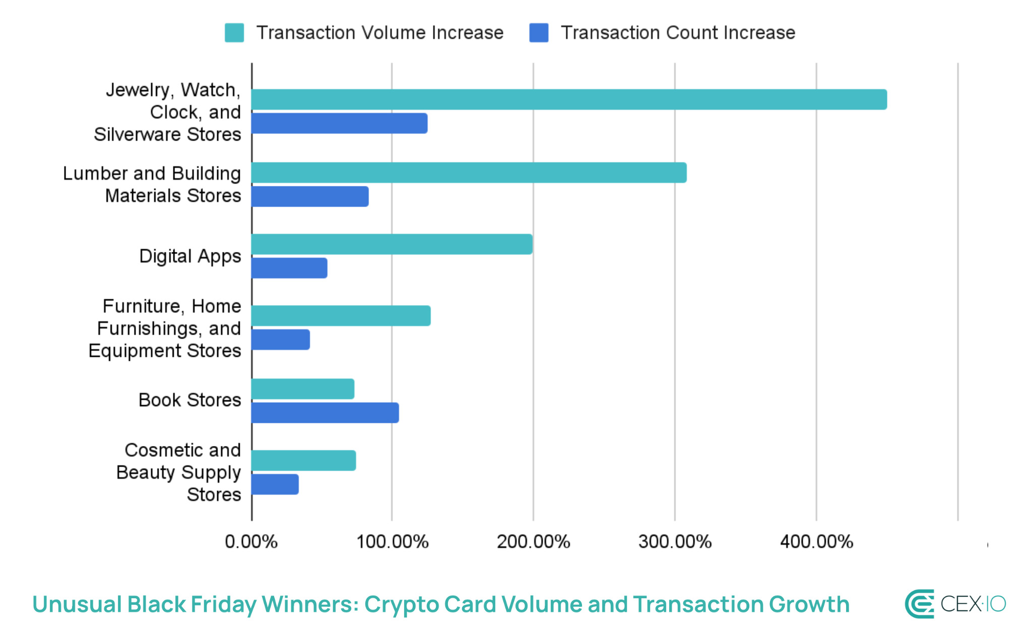 Beyond the traditional Black Friday leaders, several categories delivered unexpectedly strong results, revealing more diverse spending behavior than crypto users might be associated with.