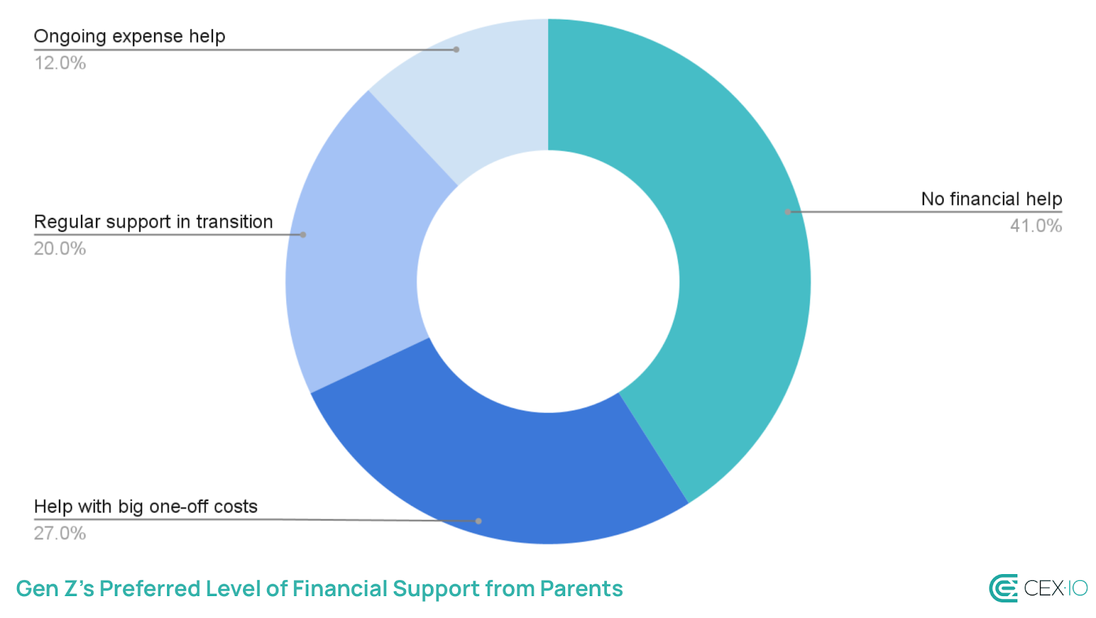If they could, 41% would choose no financial help at all from their parents, preferring to stand entirely on their own despite economic headwinds.