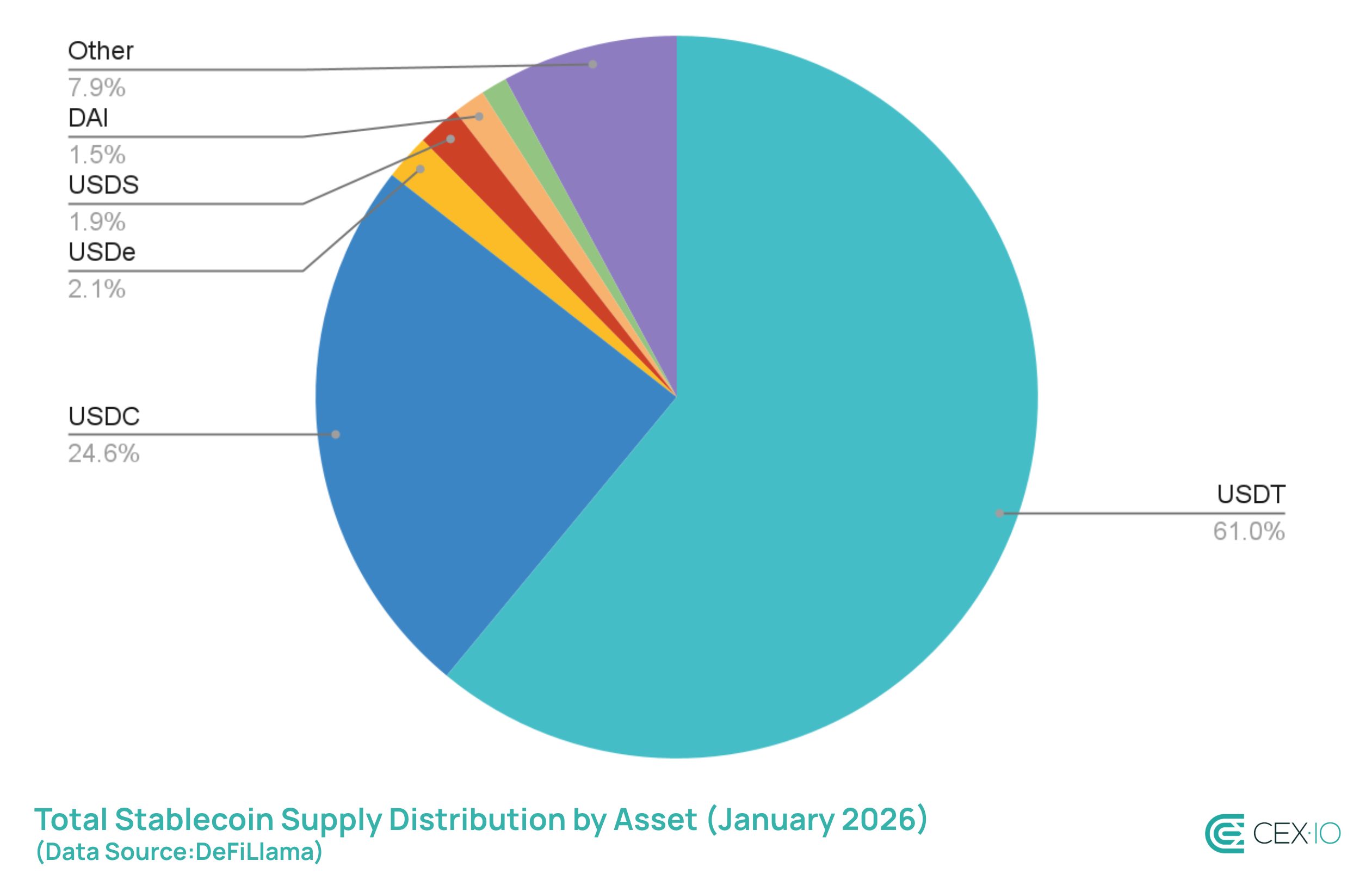 USDT maintained its position as the largest stablecoin, growing by $49.7 billion in 2025 and hitting $187 billion in total supply. While impressive in absolute terms, USDT’s market share in total stablecoin supply actually showed slight erosion, moving from 67% to 61%, as USDC and newer entrants captured a portion of the expanding market.