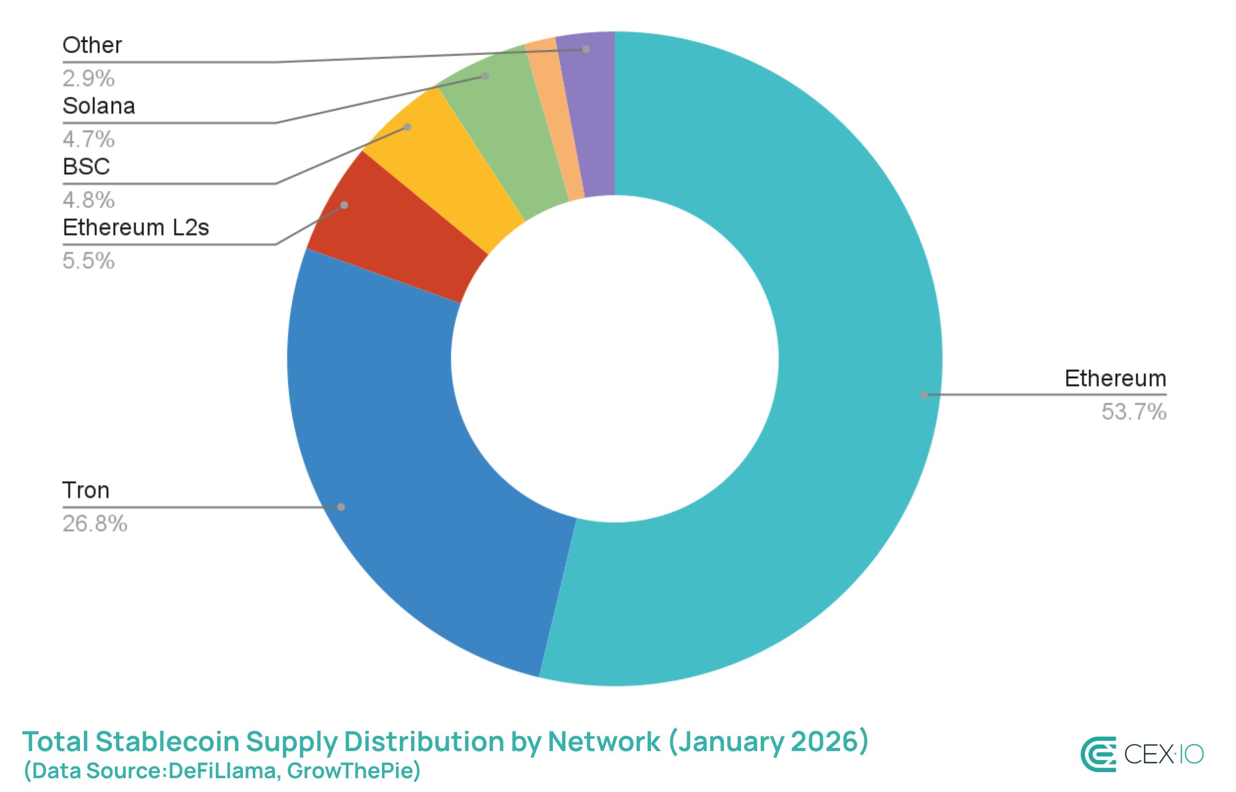 Overall, a combined share of Ethereum and Tron in total stablecoin supply decreased from 85% at the beginning of 2025 to 80% in early 2026, with BSC, Solana, and Hyperliquid capturing the most of new stablecoin supply momentum.