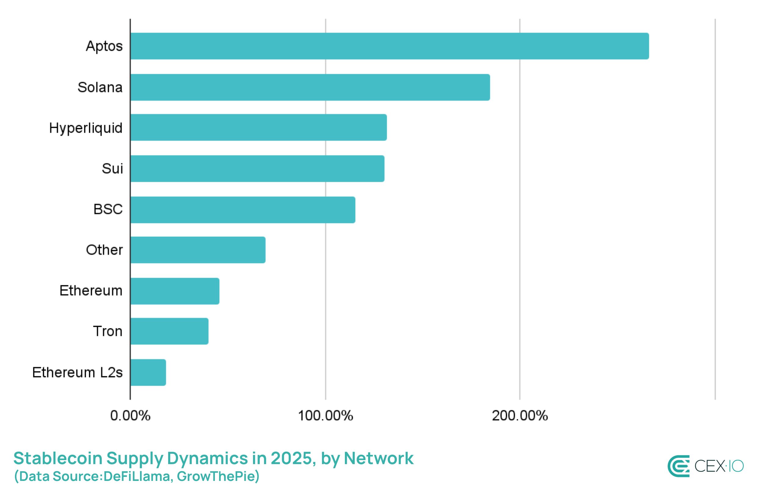 Aside from Solana and BSC, Aptos and Hyperliquid were among the fastest growing stablecoin ecosystems, registering 266% and 131% jumps in stablecoin supply, respectively.