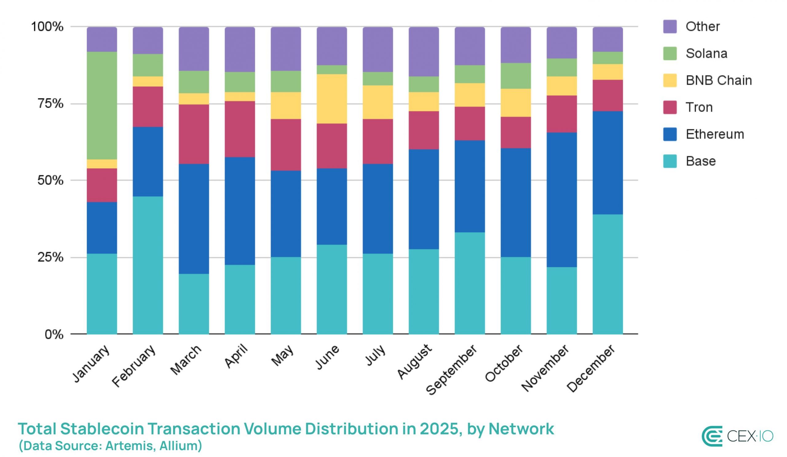 USDT volume on DEXs surged by over 285% compared to 2024, with nearly 4% of all USDT volume taking place on decentralized exchanges. In turn, USDC saw its DEX share decline from 39% in January to 23% in December. This suggests that while USDC has become increasingly adopted by CEXs, the gap on DEXs was primarily filled by USDT. The major contributor to this shift was BSC network, which saw a 4x increase in DEX volume and primarily featured USDT for transactions.