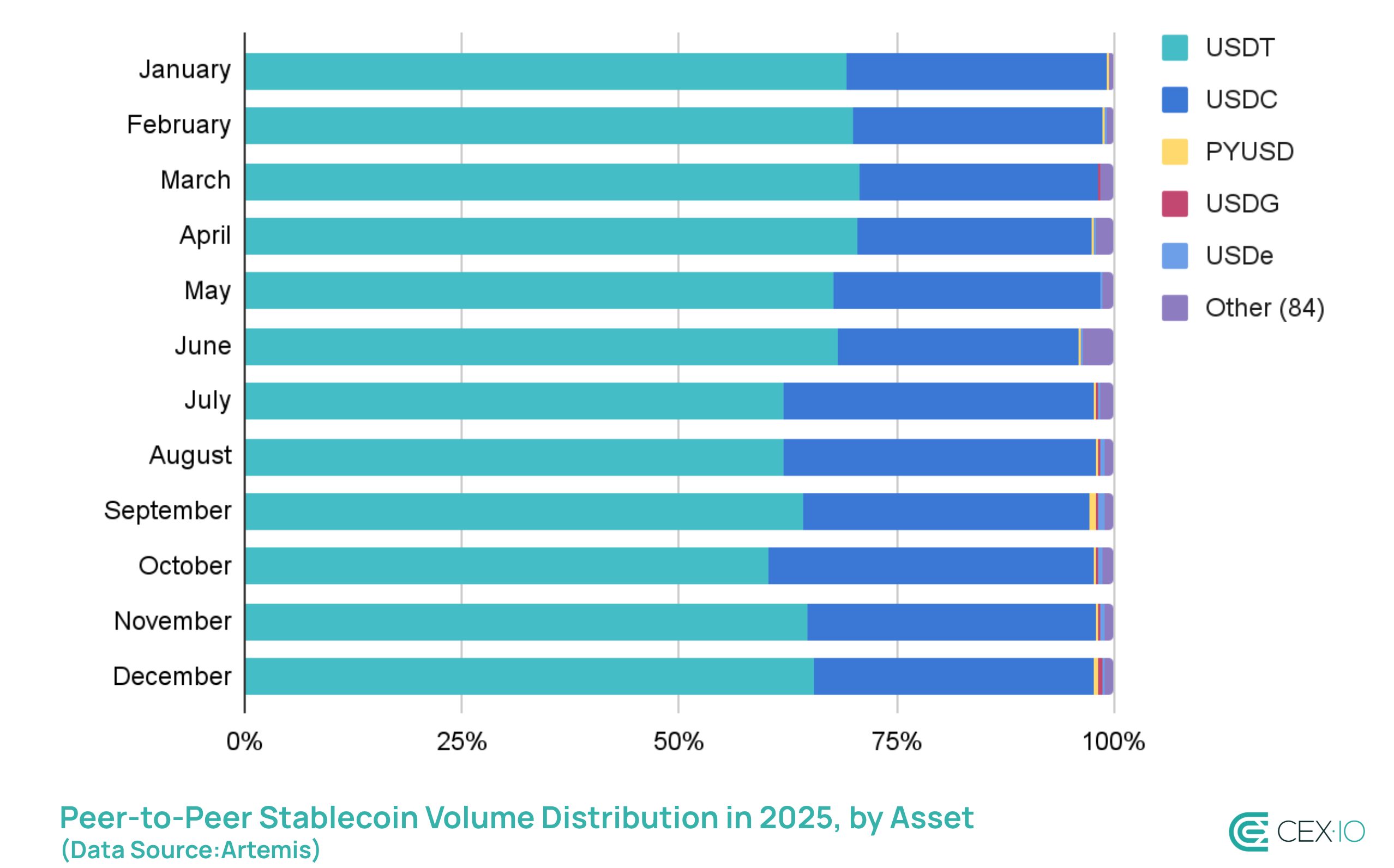 USDT is the undisputed king of P2P transfers, but its share decreased from 78.7% in 2024 to 65.3% in 2025. This was largely due to a surge in P2P operations with USDC, which increased by over 237% last year, as USDC has seen a larger adoption in the EU and other regions.