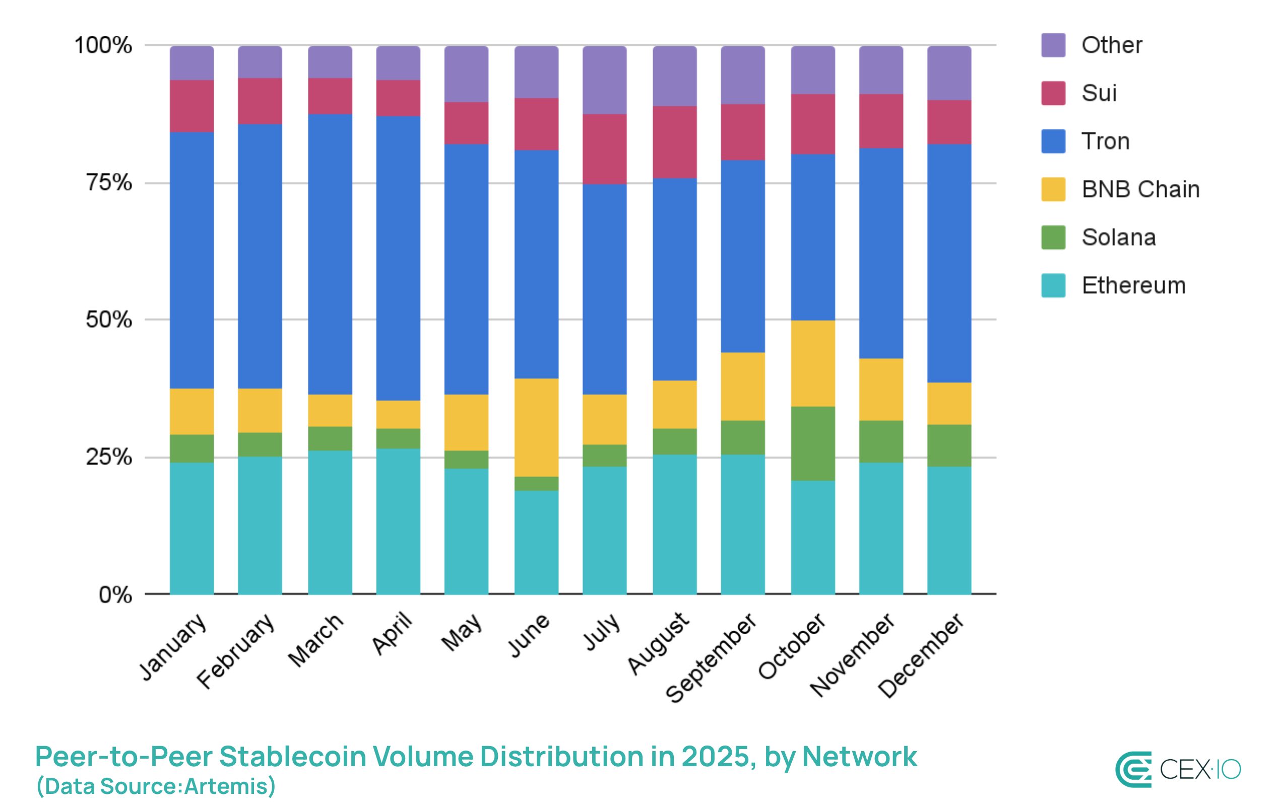 Tron, which once dominated stablecoin activity, accounted only for 13% of stablecoin transaction volume in 2025, and was increasingly displaced by more dynamic alternatives such as BSC. The latter showed nearly a 5x surge in volume.