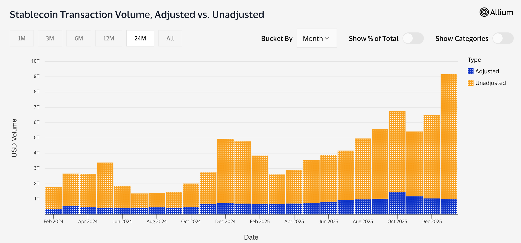 - Bot activity in stablecoin transaction volume decreased from 70% in 2024 to 68.5% in 2025.