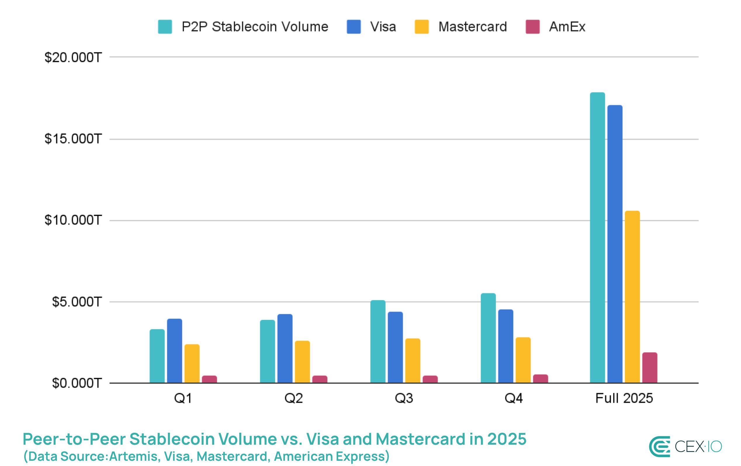Despite being a highly-filtered metric, P2P volume still reached a staggering $17.8 trillion, a 109% surge compared to 2024. This means that 2025 became the first year ever when P2P transfers in stablecoins eclipsed legacy giants like Visa and Mastercard.